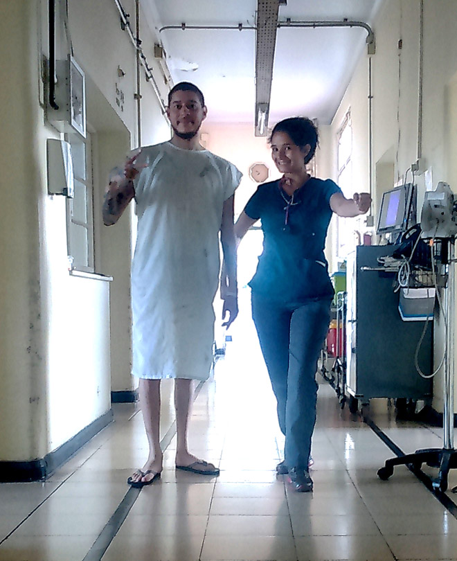 Al principio creía que solo me asistirían en la parte respiratoria, pero pronto comenzaron a evaluar cómo me sentía al sentarme al borde de la cama, ponerme de pie y caminar alrededor de mi cama. Uno de los pasos más importantes fue salir a caminar fuera de mi sala, es decir, el pasillo.